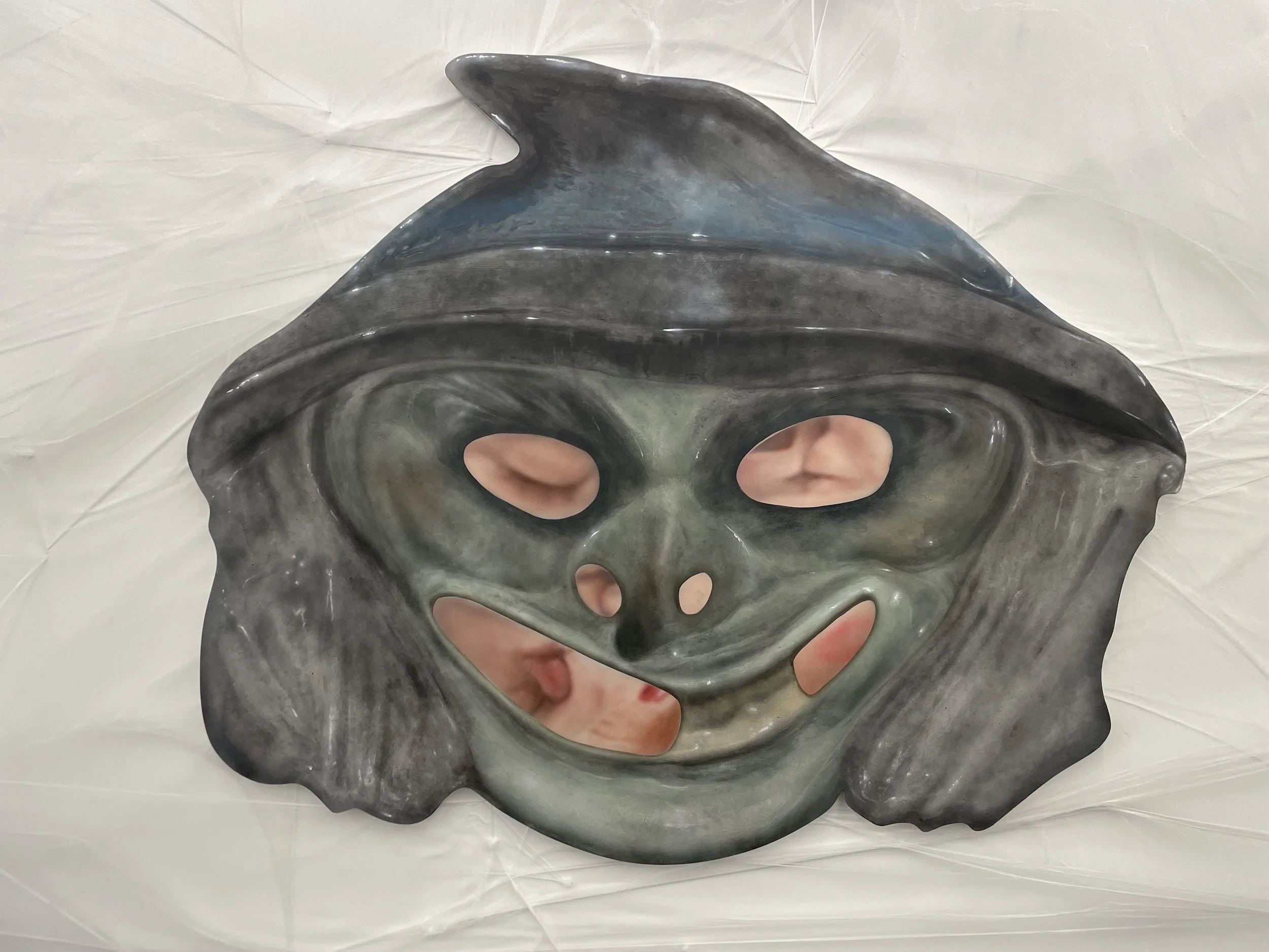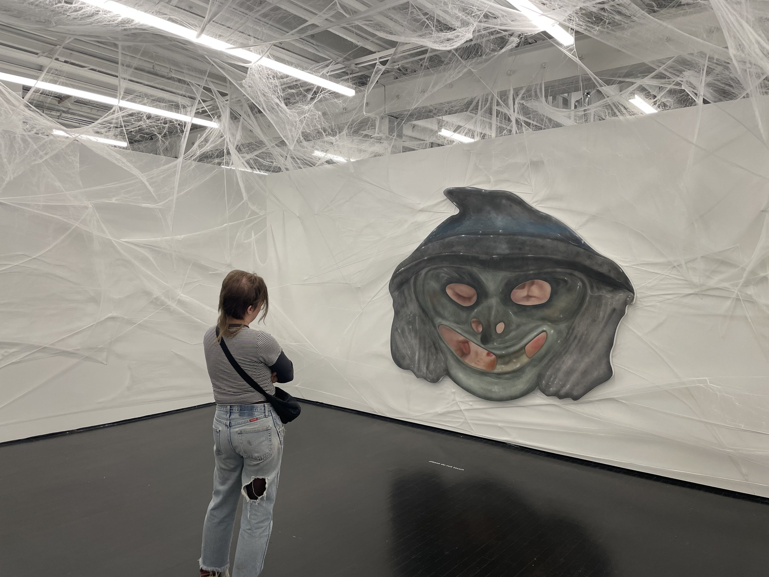 Hidden behind several walls is an installation defining its own room defying the expectations of wall space. Cobwebs are strewn around the painting and around the enclosure, integrating the wall and ceiling space as a means of consuming those witnessing this work. Confronted with intense distortion, viewers of the work peer into the inside of a Halloween mask onlooking a couple’s embrace. In Through Your Eyes (2023), there is a clear pang of jealousy, otherness, and loneliness present through this lens. Maybe the viewer has stumbled upon an embrace that they were not meant to witness. As if emerging from the body, the viewer is distancing themself from the mask, becoming observer rather than participant in the viewing of this passion. Abdella includes these cobwebs not only as a reference to an ongoing theme present, but to the notion of recording memory. Similar themes of being on the inside looking outwards are prevalent