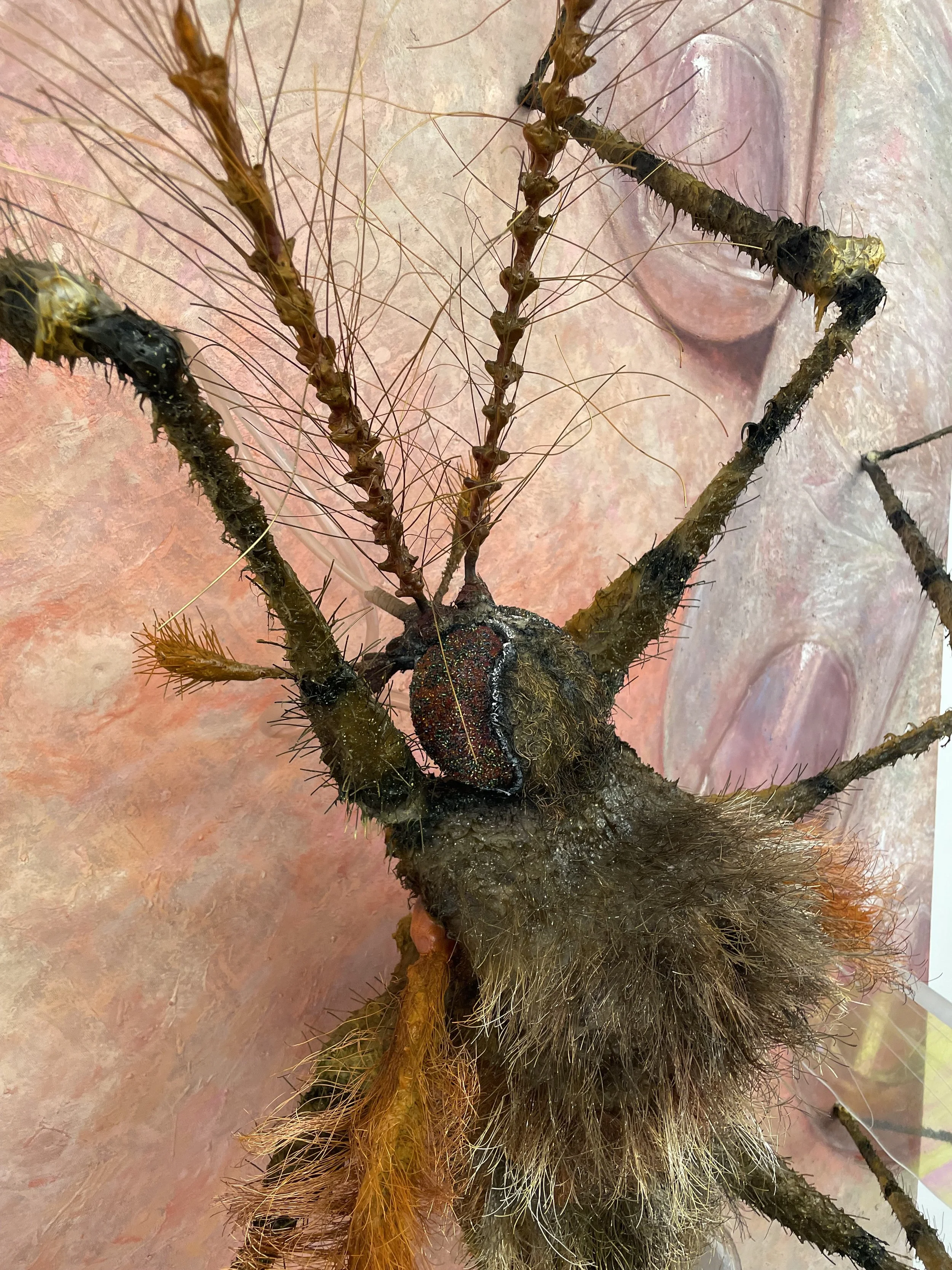 Abdella has trained classically in figurative oil painting, which comes as no surprise while viewing the integrity of the painting quality. His attention to texture provides the perfect base for any physical sculptural elements, and lends itself that much more to the integration of material. Much of the canvas itself is manipulated beyond paint and epoxy, but is handled in a way that three-dimensional mosquito bite lumps rise above the textured ground of the canvas. Inspired by animatronics, he has mechanically engineered elements of a pump protruding from the mosquito, mimicking real encounters through near-autonomous puppetry. I am fascinated by the planar relief and levels of disruption to negative space, which is frankly hard to pin within traditional two dimensional surfaces. Expectation is thus successfully broken and pushed into ways of activating space above the painting’s surface, both in the physical and immaterial.