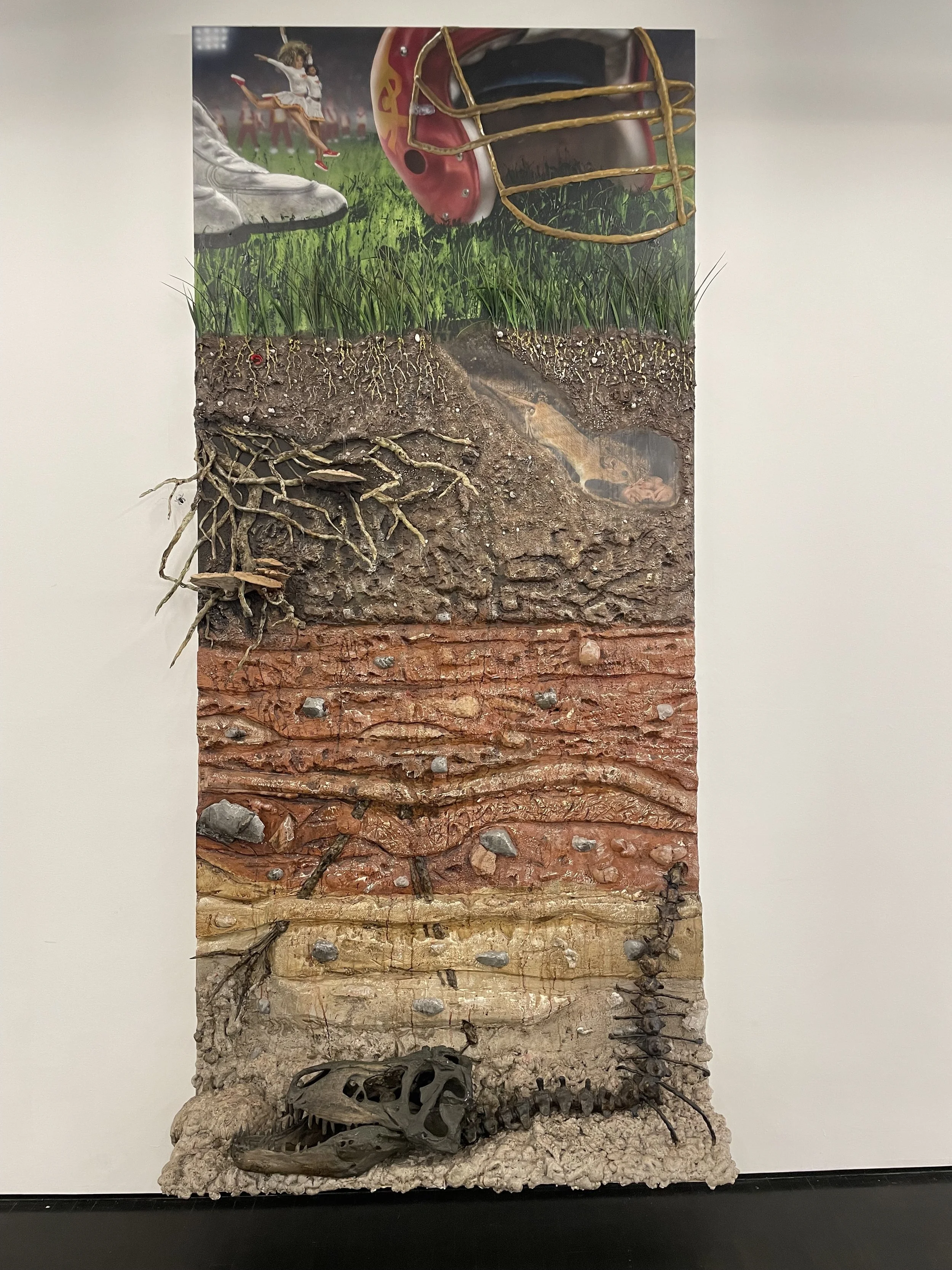 Falling between kitsch, science history, and art museums, Abdella’s work can function in several capacities. This notion rang true upon viewing Six Feet Under (2022), which could exist without question in other places outside of the art museum institution. Playing on elements of stage and set design, Abdella utilizes materials such as paper mache and foundational elements for sculpture in order to create a layering of organic material beneath the soil that is believable, but lacks the real authenticity of bone. The viewer understands the falsehood of these elements, but is still understanding what these objects are representative of. Staged above layers of earth, a football game takes place amidst the turbulence beneath the soil. Viewers are drawn in to question what lies beneath our own foundations, what histories are being built over, and what role do humans actually occupy in terms of the infinite microcosms within earth’s core?