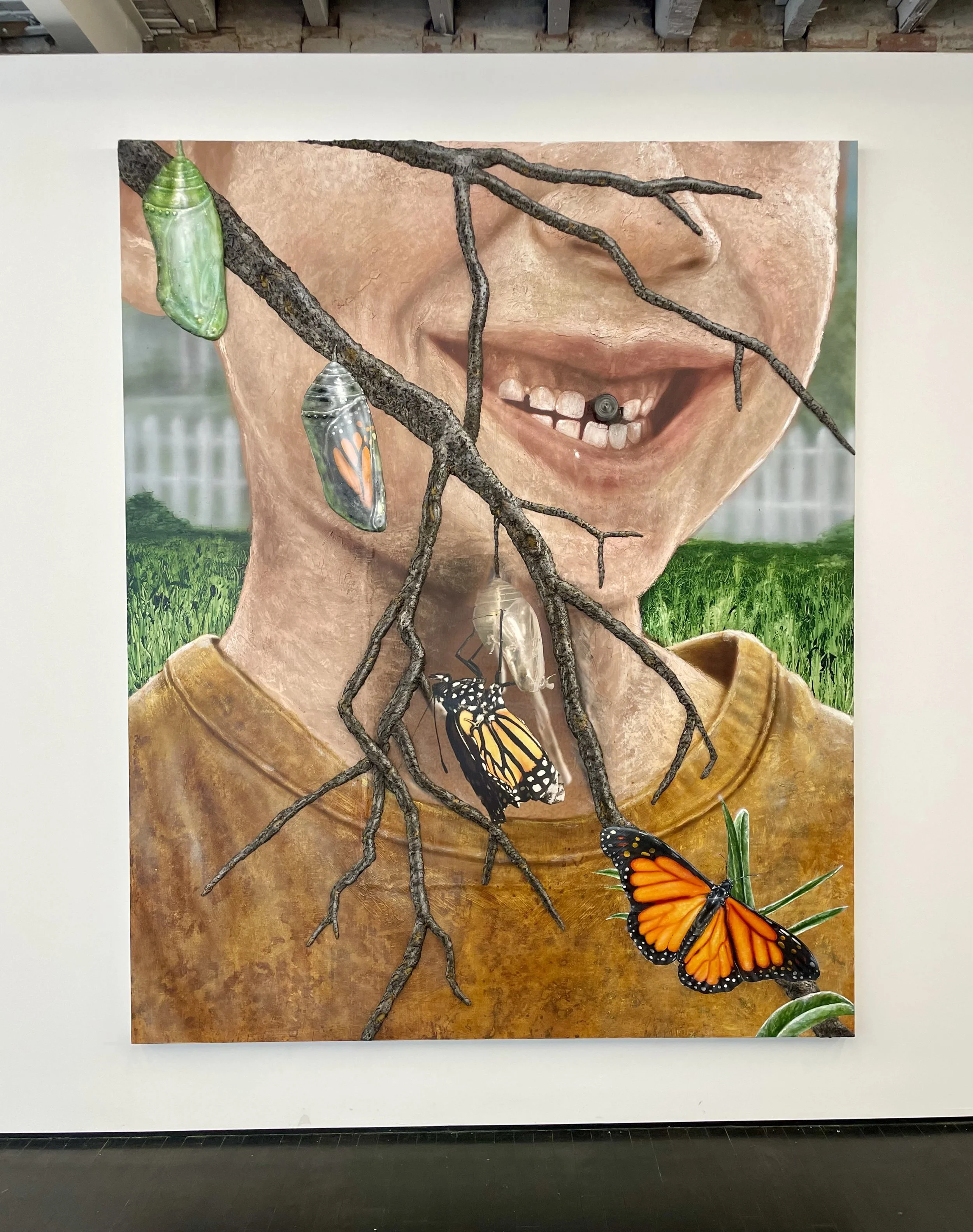 Flying in controlled chaos, a buzzing fan demands immediate attention, serving as a visual function for the front tooth amidst the darkness of space. Across the image a branch protrudes from one corner to the other, creating a stabilizing foundation in which the stages of chrysalis are anchored within the foreground of the work. In the center of the painting, I am confronted with a lenticular print collaged within the work. Which do I choose to observe first? Which elements force my body to move around the work and engage with a painting as a sculpture? This seamless integration of print to sculpture to paint is what makes this body of work so compelling. Abdella has a clear language presented that transcends medium through sophisticated integration of material and craft skills, or material intelligence.