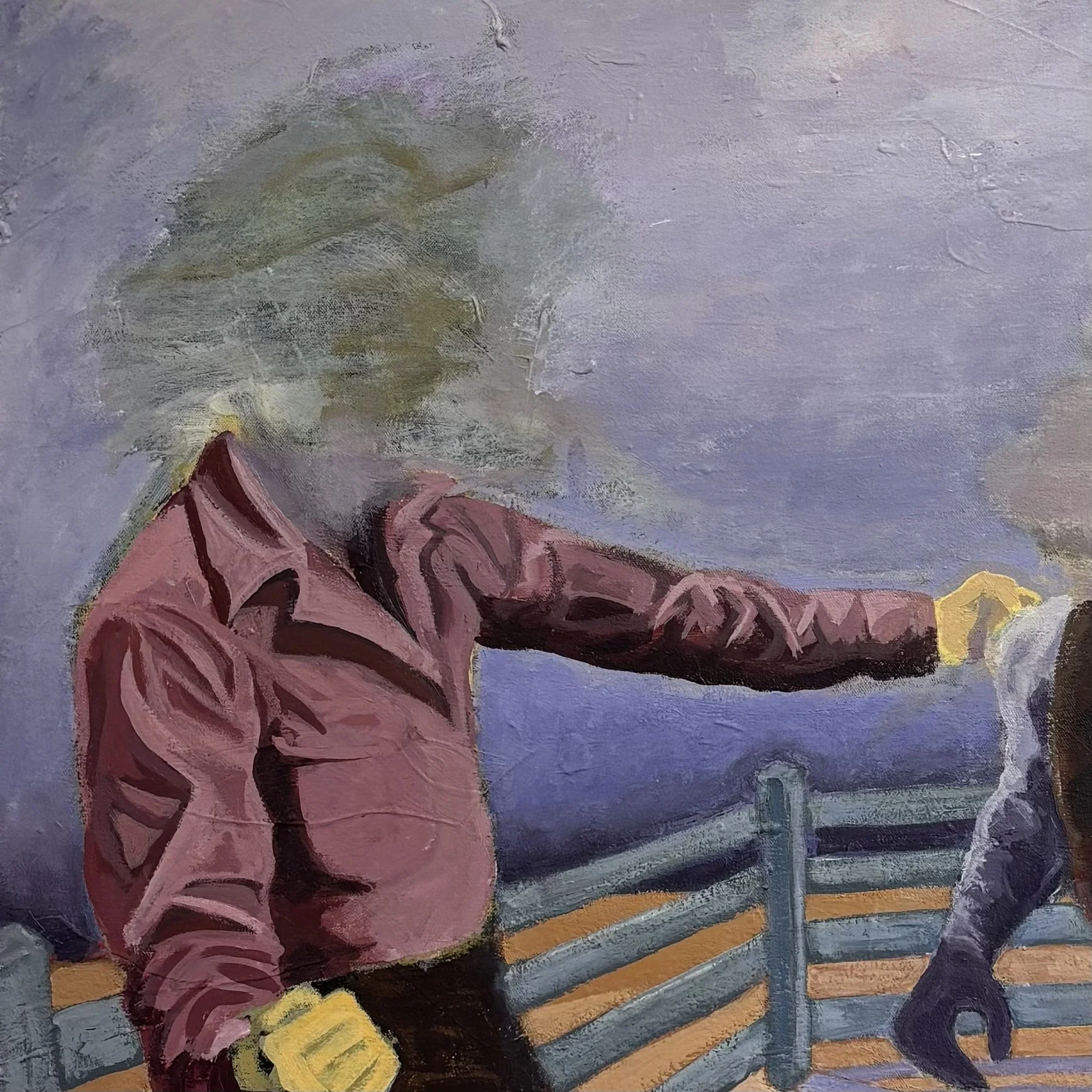 Replayed to exhaustion, the exhibition’s automotive focus turns confrontational, eventually giving way to two paintings that find release through brawling bravado. Trapped in the ring of containment, the spectacle of American masculinity takes center stage. Enduring, driving impact finds its outlet through power. In Anderson’s Dancing in the Midnight Corral (2025), yellow gloves recur from the artist’s video work as the most legible point of continuity amidst faceless opponents. Bodies exert effort to strike each other, exacting violence without vision. The corrosive persistence of physical force spurs from the masculine logic of infinity without pause. Violence emerges as the last language available to a system that cannot imagine a beginning or an end but binds all within a race toward some endless, eternal horizon.