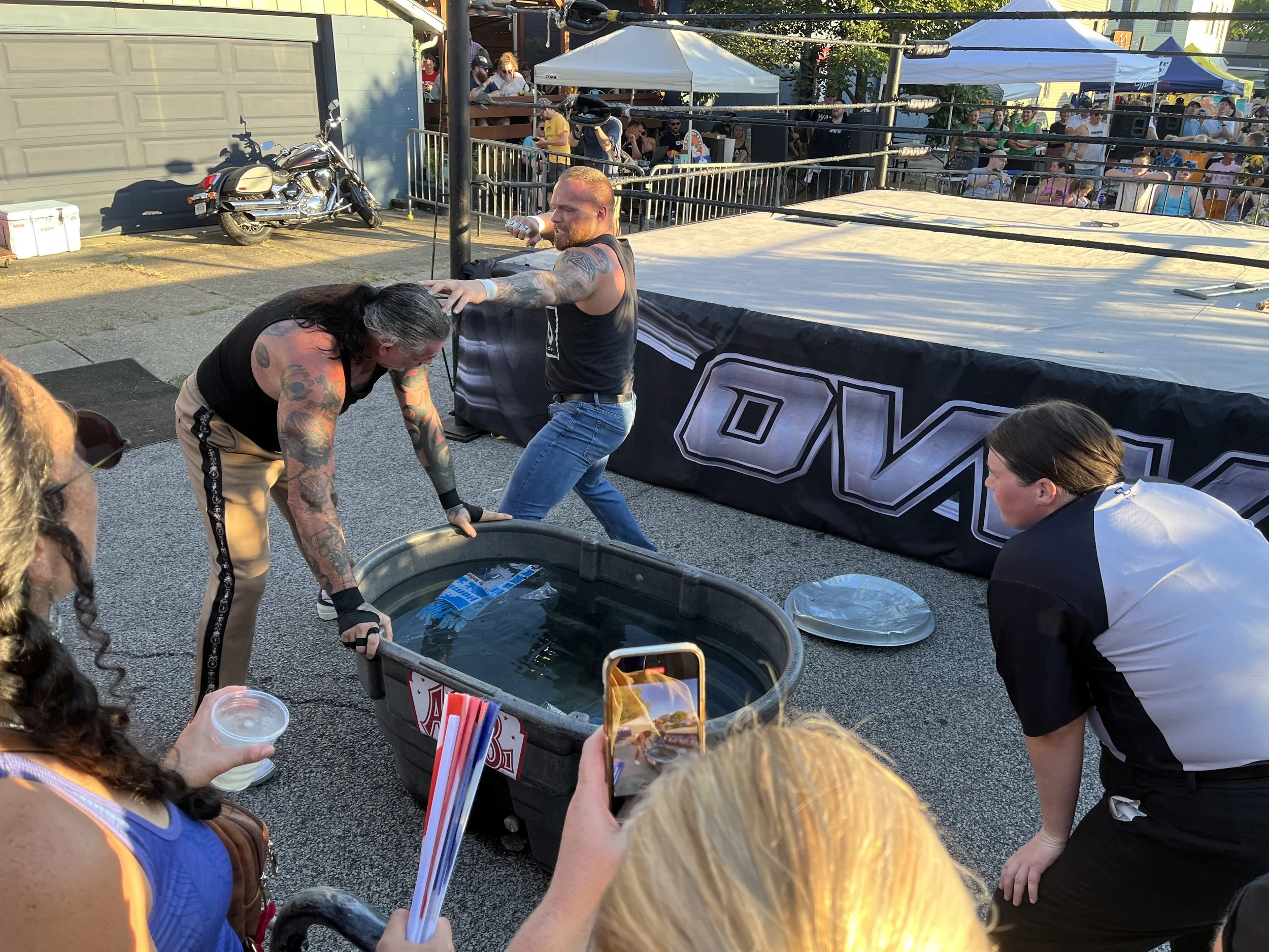 Approaching the barricaded block of Hickory Street, now occupied by a full-scale OVW wrestling ring, I felt myself like a peasant visiting the town square only to find an itinerant theater troupe had arrived that morning. Had I not already been following this story, I’d perhaps have thought, “hey, why not?” The evening’s performers were tasked with capturing an audience composed mostly of people who’d be there drinking regardless. The temperature hovered around ninety degrees, and the air-conditioned bar was alluring.